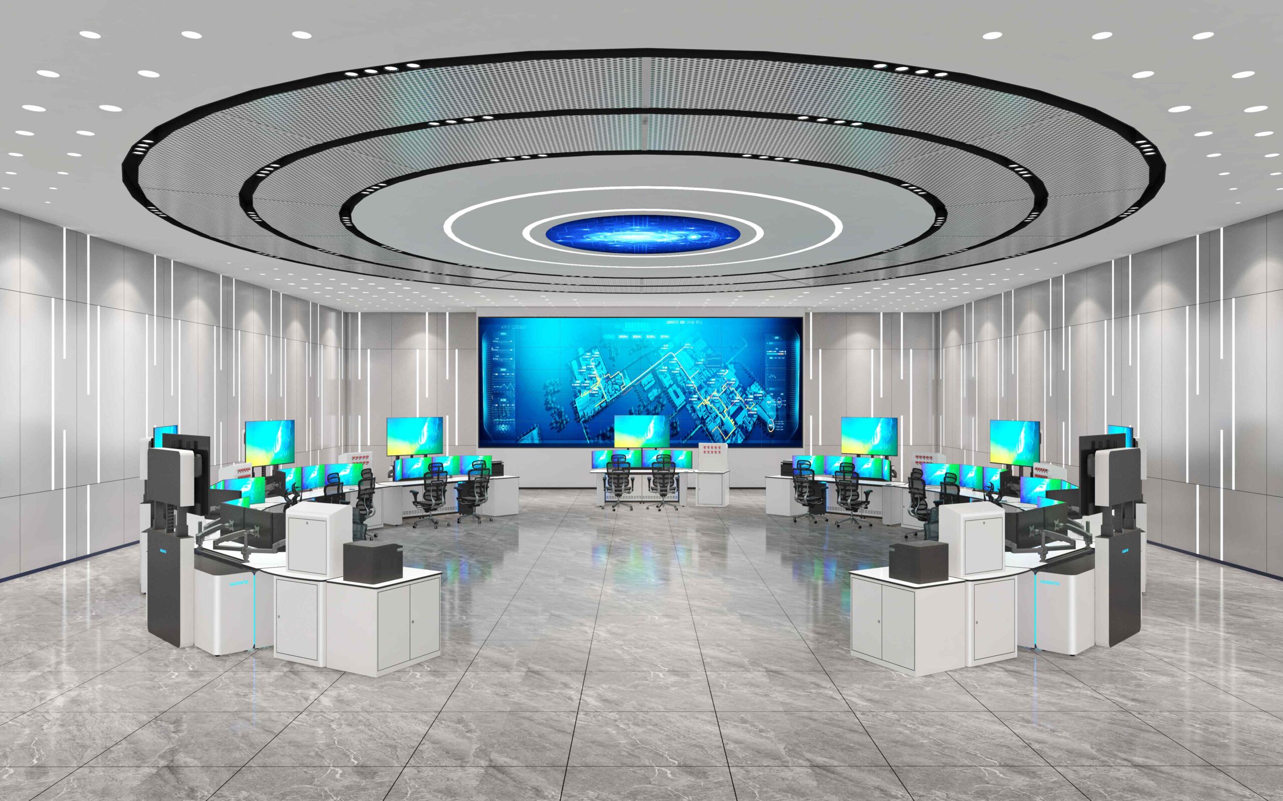 Explore command centers as showcases for corporate strength. Analyze how WuBang consoles use industrial aesthetics and lighting to create a prestigious environment.